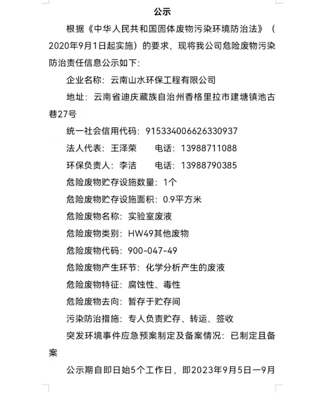 云南山水环保工程公司危险废物污染防治责任信息公示